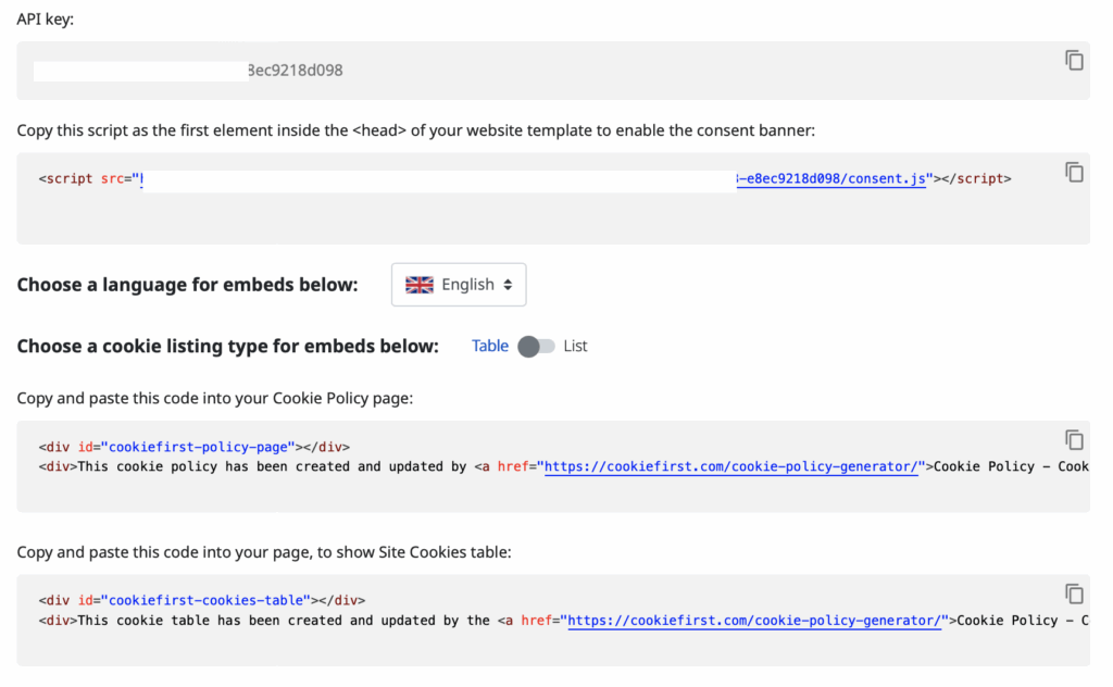 - The last field has an embed which lets you only show the cookie table. This might be useful for when you have a great markup of your own cookie policy.