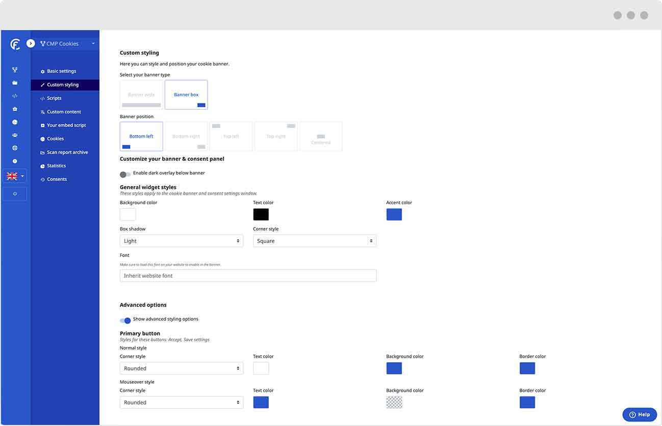 Umożliwiamy Ci stworzenie własnego banera plików cookie i panelu zgody z Twoją marką. Możesz zmieniać kolory, czcionki, typ przycisków i wiele więcej. Możesz również wybrać typ banera – czy chcesz, aby był on umieszczony u góry, czy u dołu ekranu przeglądarki? Czy chcesz, aby miał szerokość 100%, czy wolisz mniejszy baner w ramce? Dostosuj go tak, jak chcesz.
